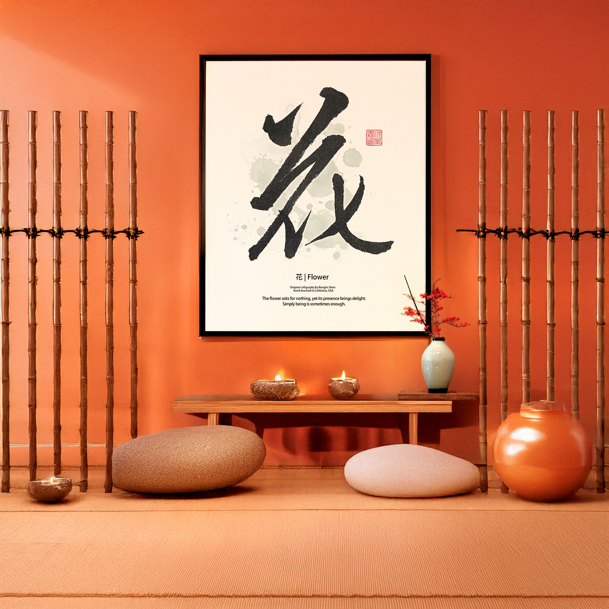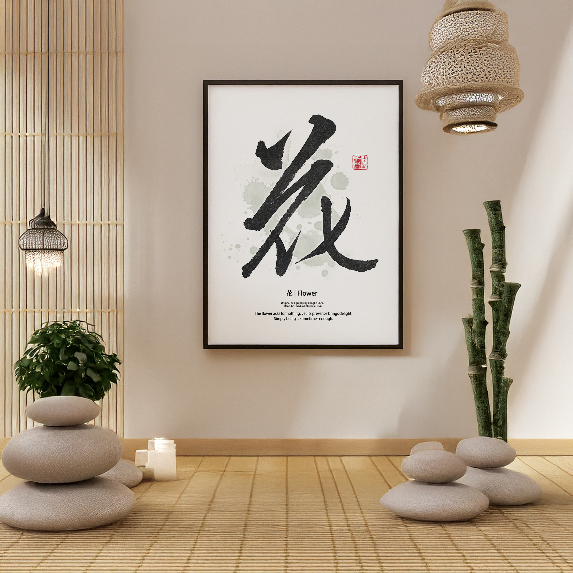 The character “花” (Flower) carries deep symbolic weight in East Asian aesthetics — representing impermanence, natural beauty, and quiet resilience. In Zen philosophy, a flower is not merely decorative — it blooms fully in the present moment, then lets go without regret. A profound metaphor for mindfulness and acceptance.