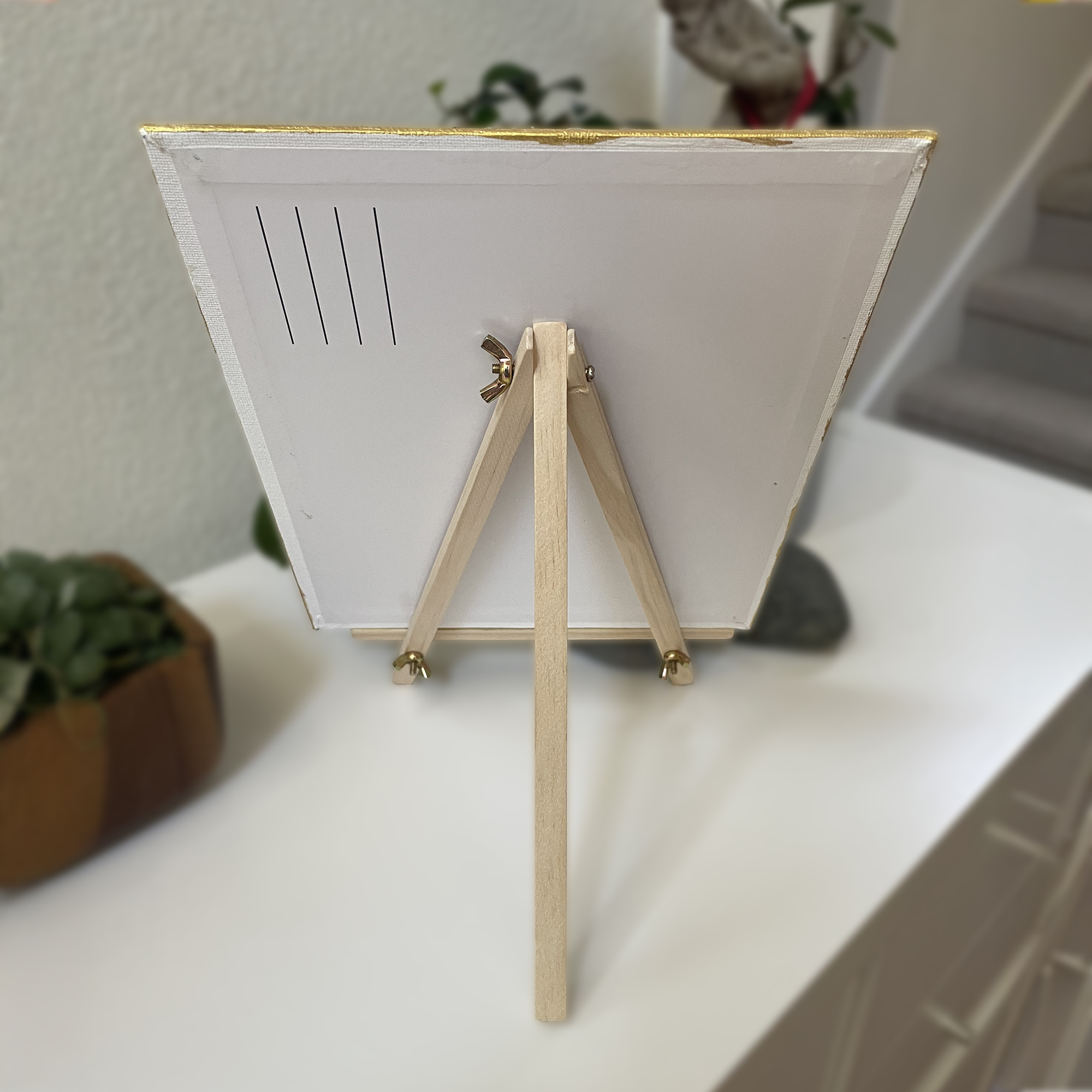 Materials: Acrylic paint, gold metallic ink, canvas panel, and artist seal.