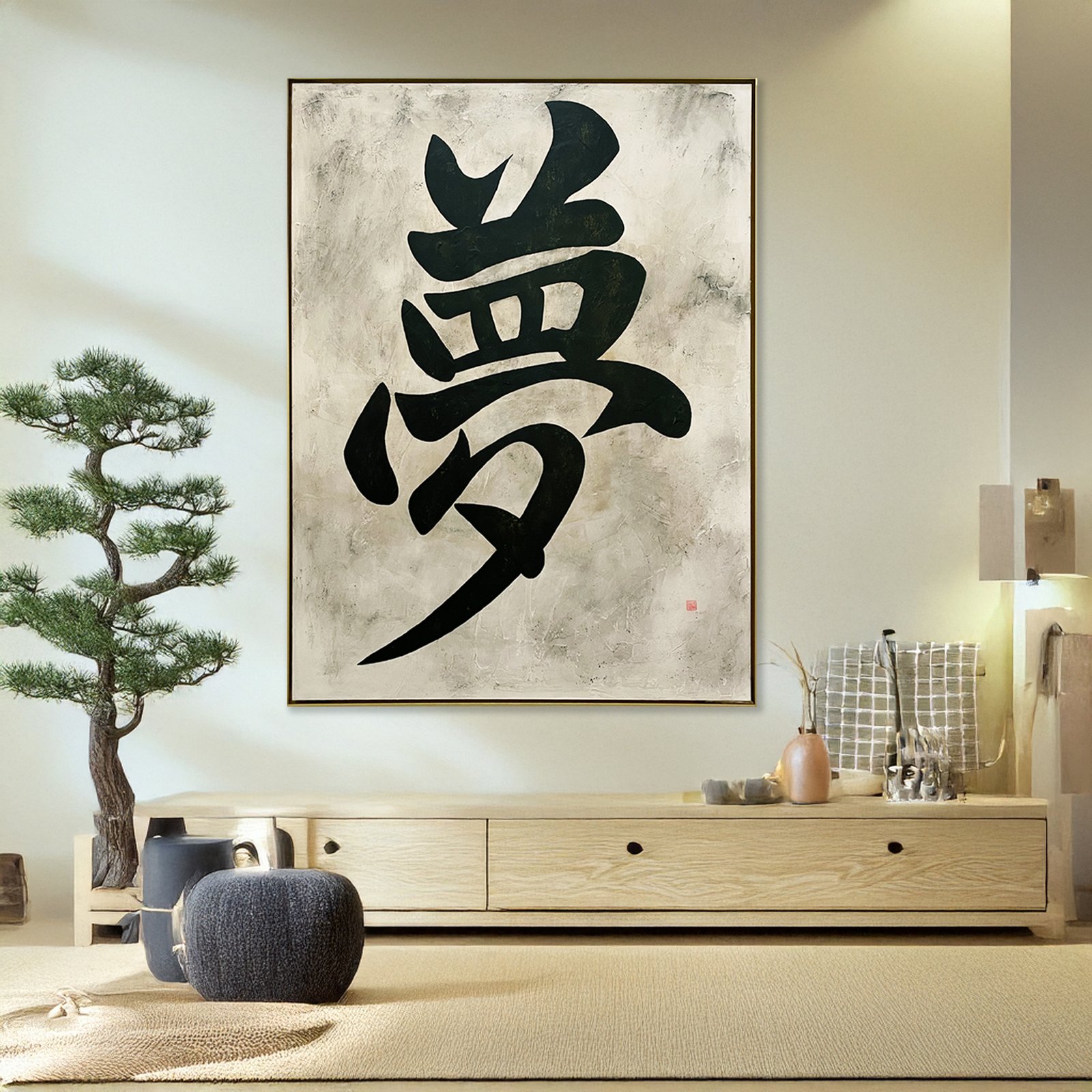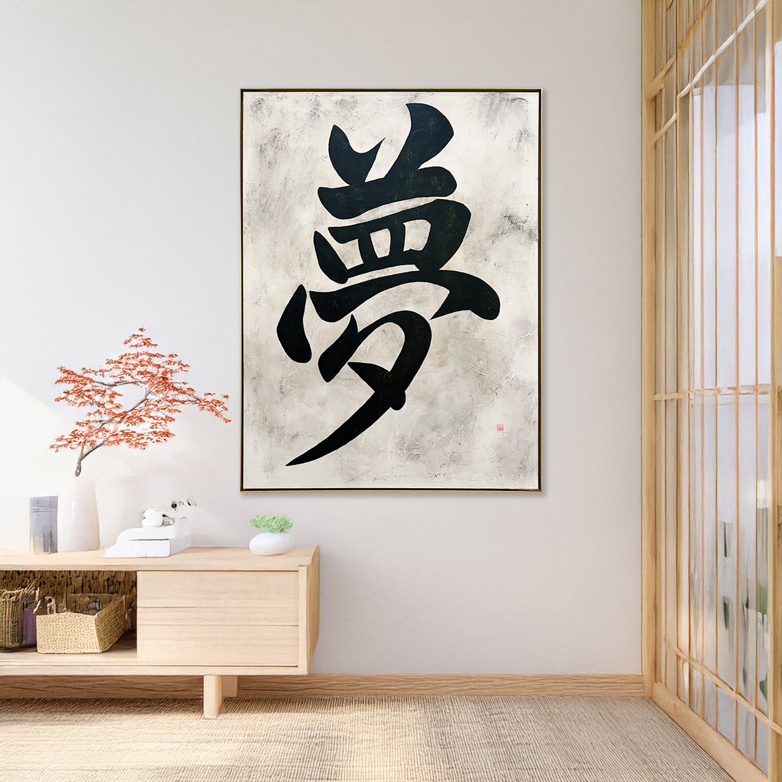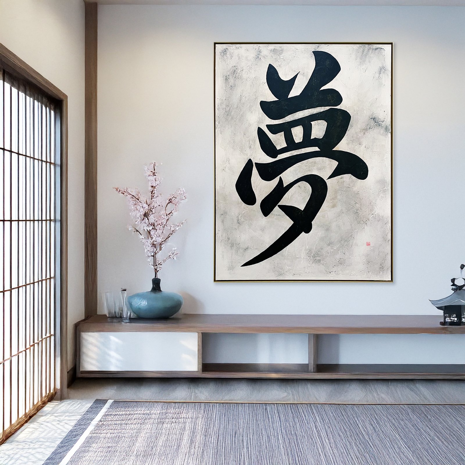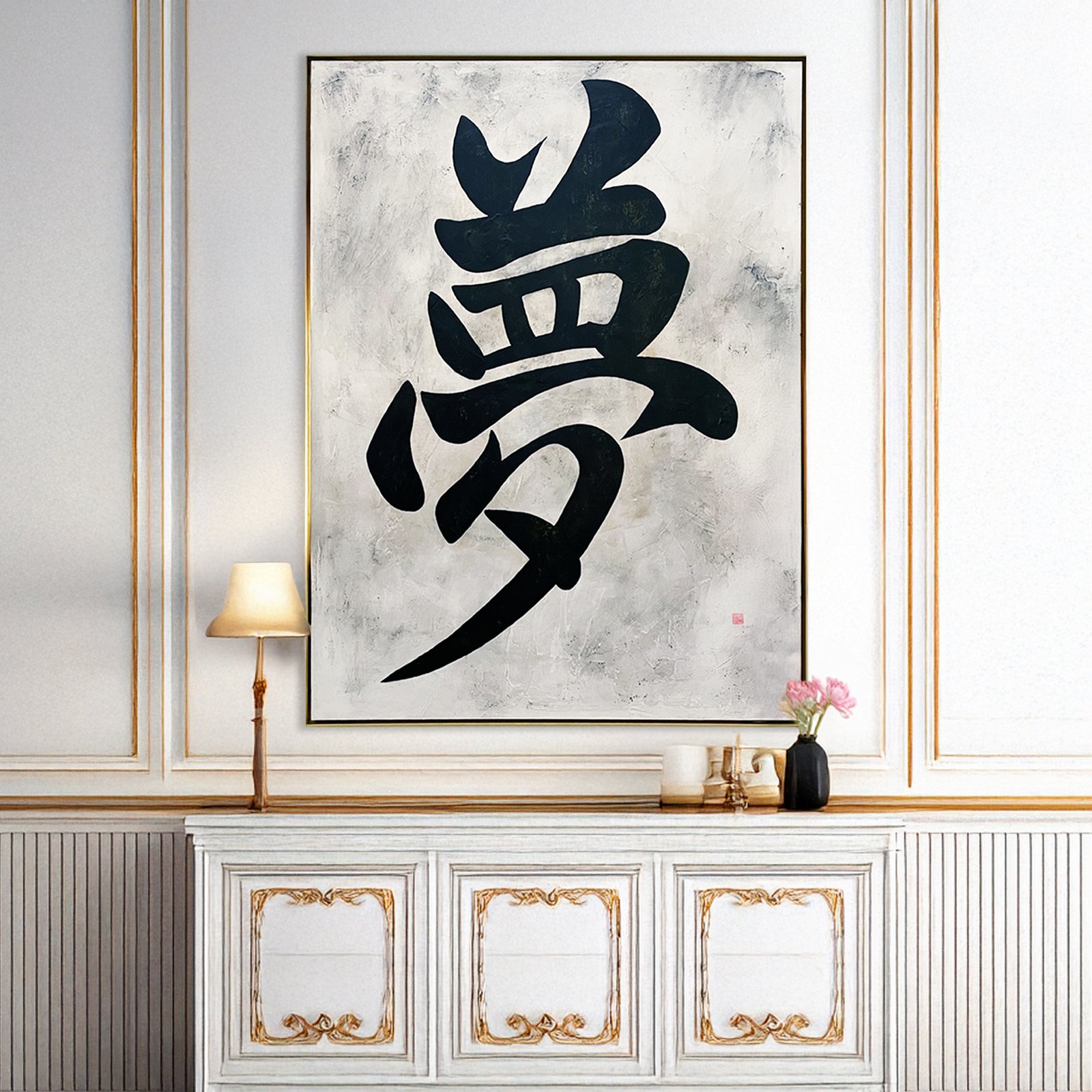 Elevate your space with this striking fusion of traditional Japanese calligraphy and modern abstract black-and-white art. This large-format painting features the Kanji for “Dream” (夢) — a symbol of vision, imagination, and hope — rendered in bold, expressive strokes using professional-grade acrylic paint on richly textured canvas.