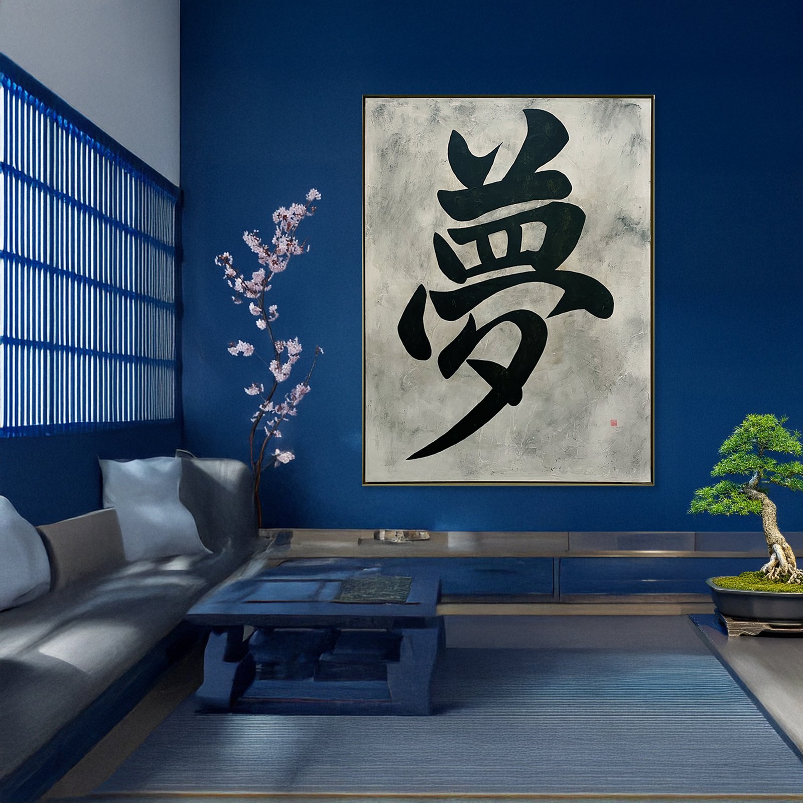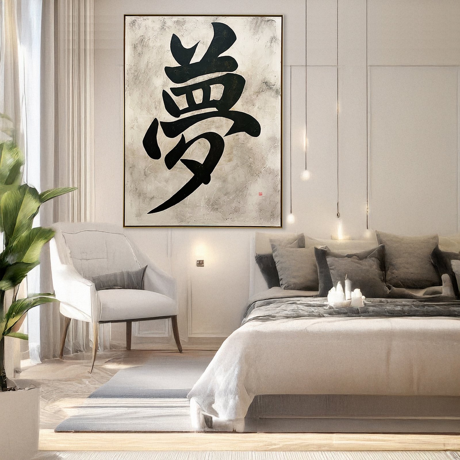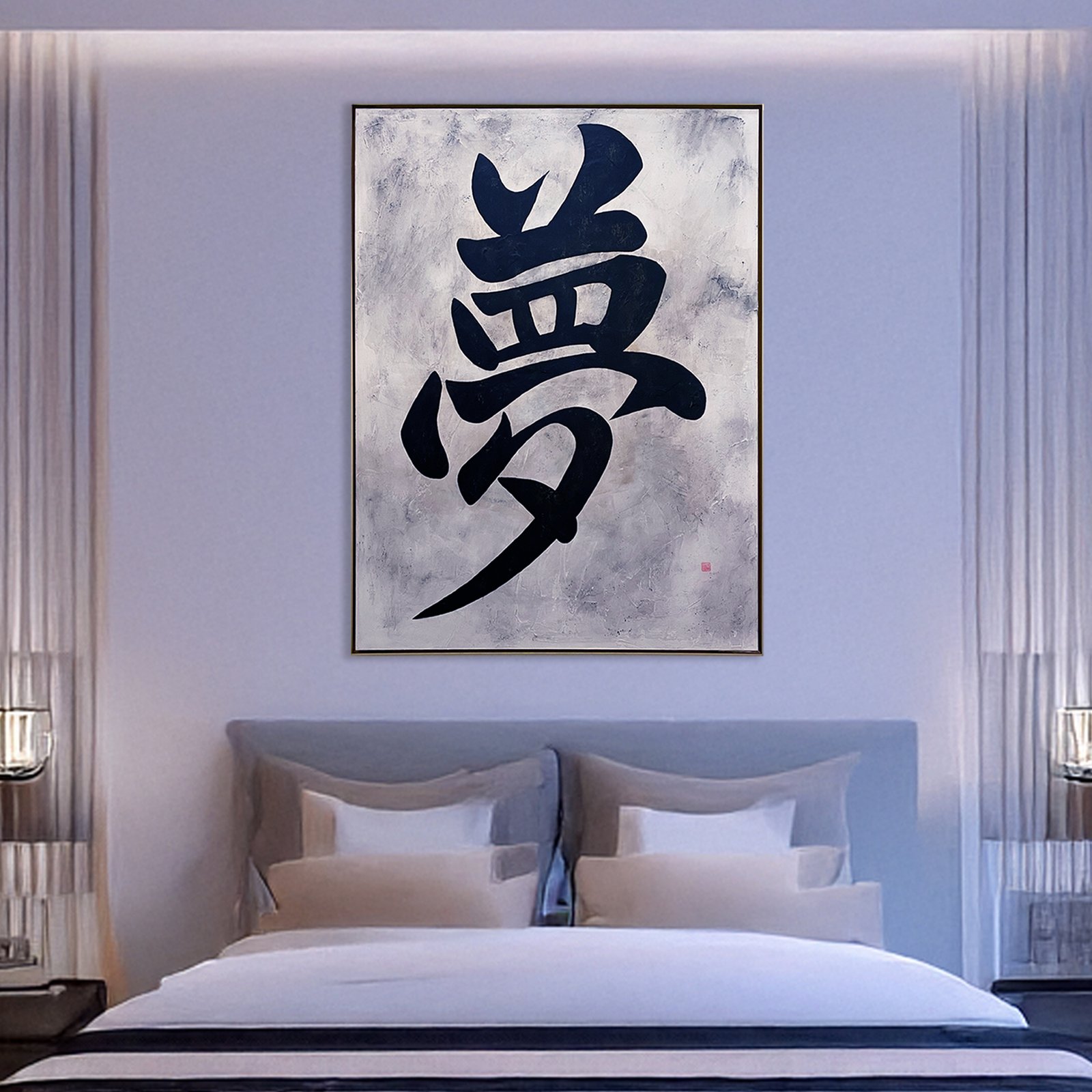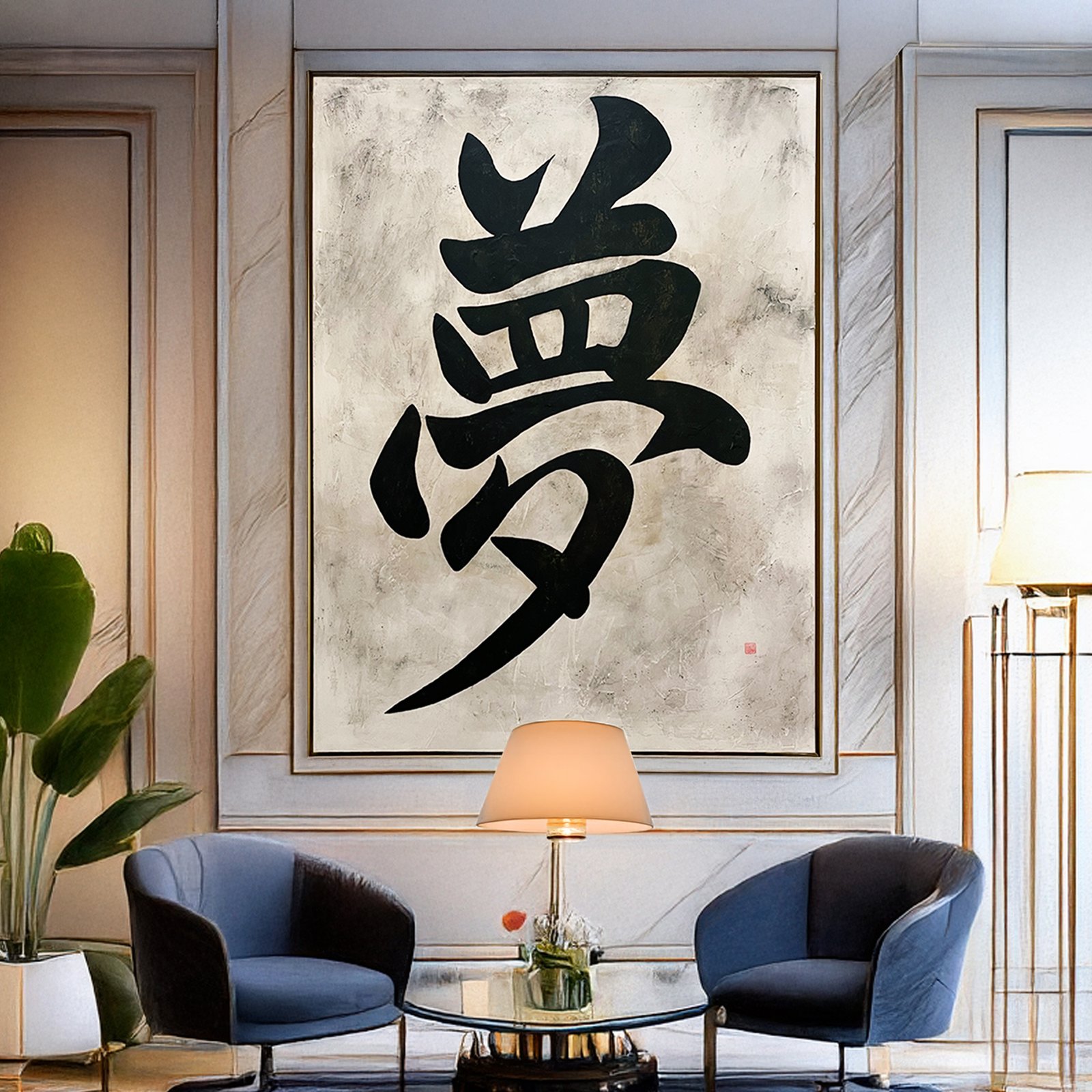 Elevate your space with this striking fusion of traditional Japanese calligraphy and modern abstract black-and-white art. This large-format painting features the Kanji for “Dream” (夢) — a symbol of vision, imagination, and hope — rendered in bold, expressive strokes using professional-grade acrylic paint on richly textured canvas.