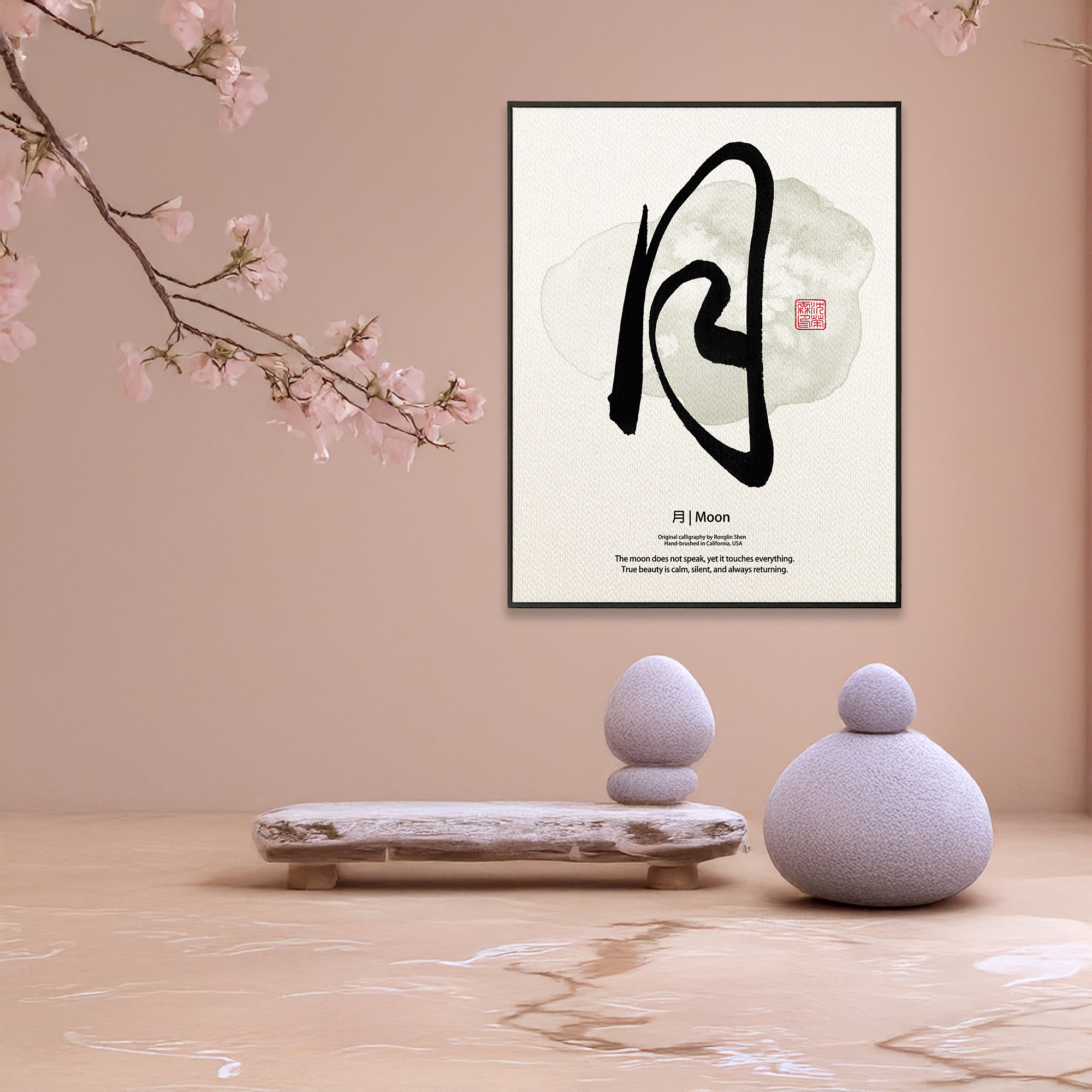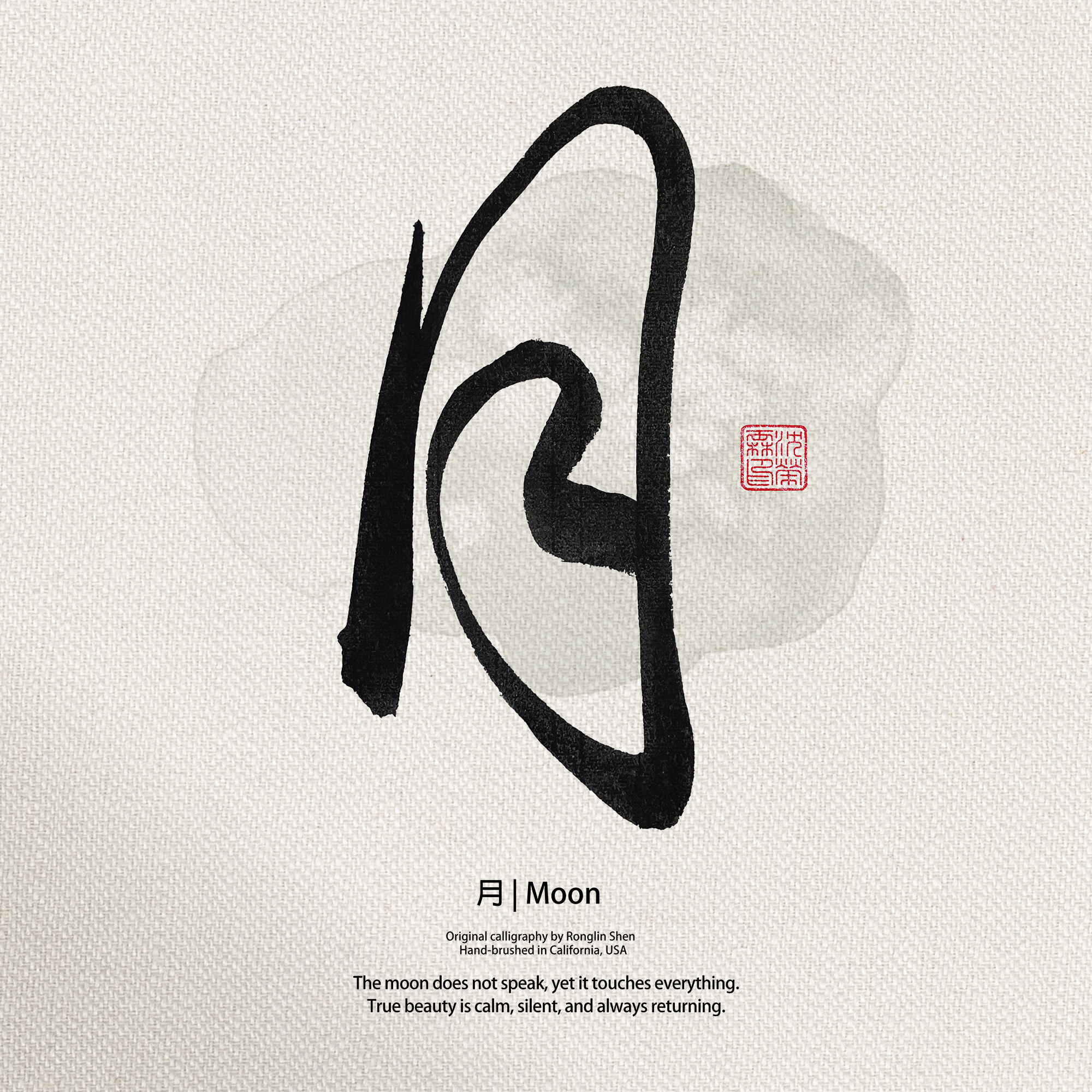 The character “月” (Moon) embodies a timeless symbol in East Asian aesthetics — reflecting serenity, rhythm, and quiet illumination. In Chinese and Japanese traditions, the moon is not merely a celestial body, but a mirror of inner stillness, the cyclical nature of life, and the beauty of what is seen through silence.