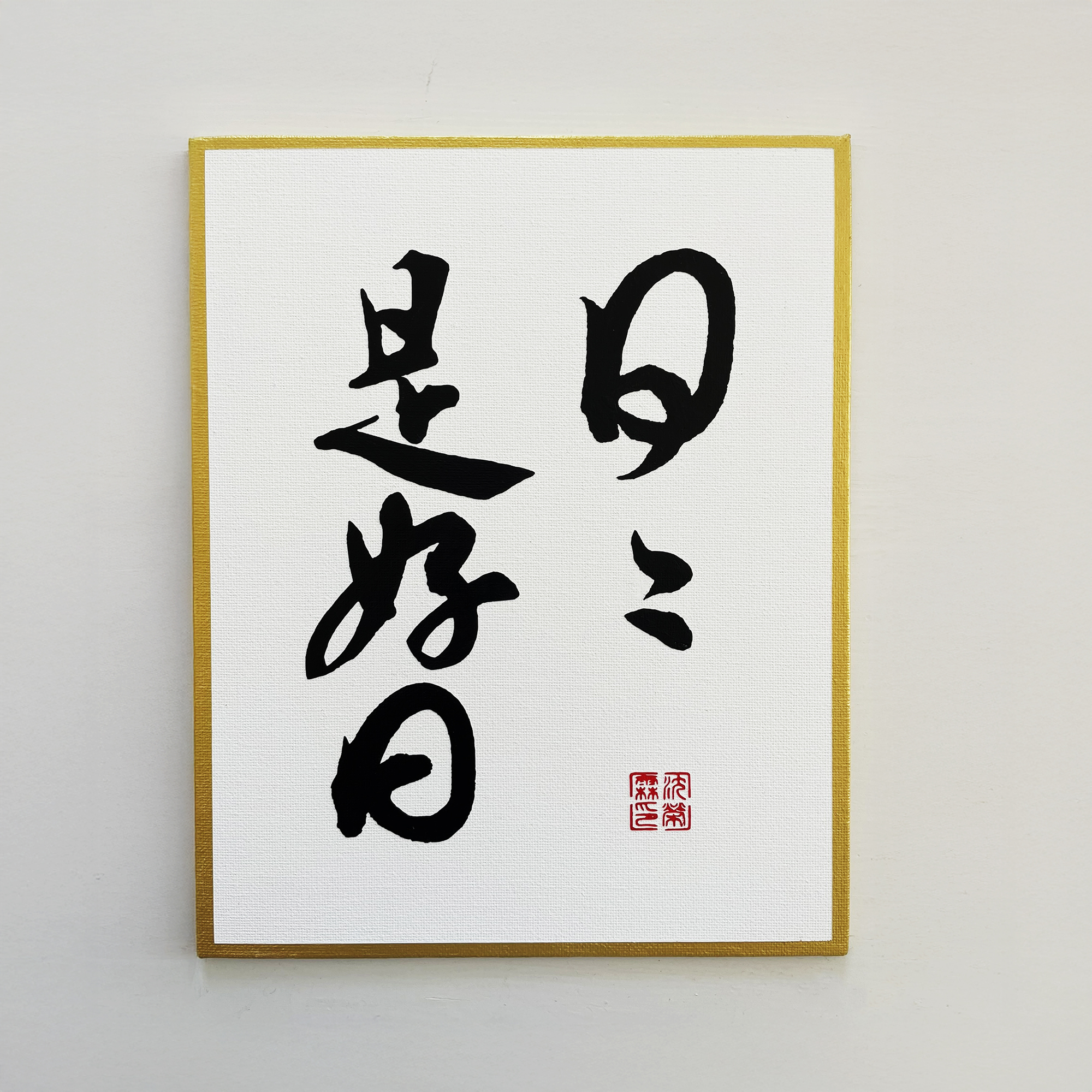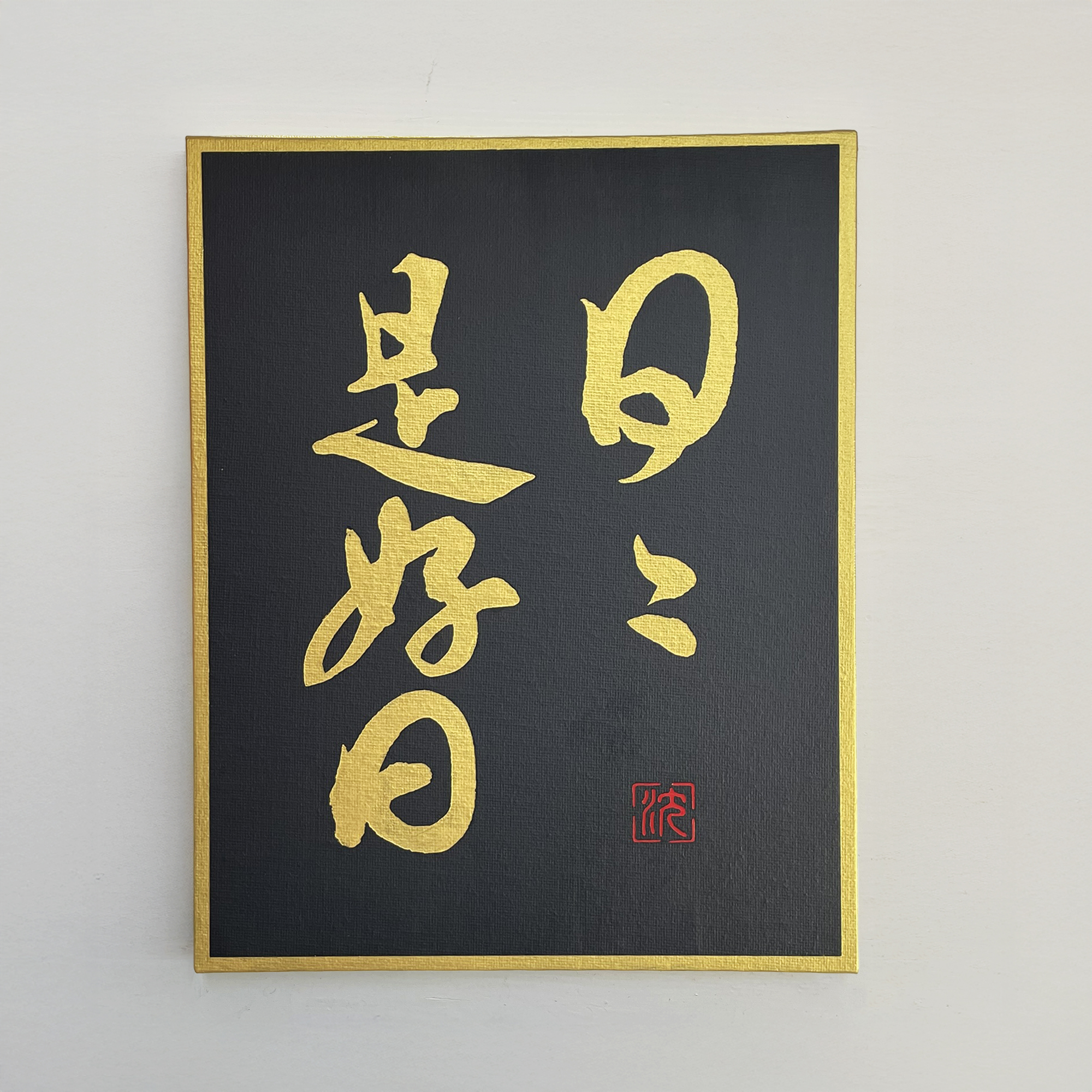 Japanese Calligraphy Art – “日日是好日” (Every Day is a Good Day) – Hand-Painted Shodo on Canvas with Gold Trim